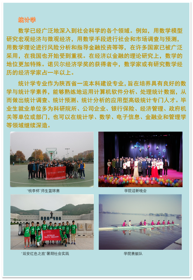 公司现有数学博士学位授权一级学科点、统计学硕士学位授权一级学科点、应用统计硕士专业学位授权点,数学博士后科研流动站,以及数学与应用数学(国家级一流本科专业建设点)、信息与计算科学(国家级一流本科专业建设点)、统计学(陕西省一流本科专业建设点)3个本科专业,并招收旨在培养拔尖创新型复合人才的数学基础拔尖班。公司目前设有4个系、1个研究中心、1个研究所。现有教职工 127人,其中专职教师116 人,包括国家级领军人才1人、国家“新世纪百千万人才”1 人、国家级教学名师1人、教育部教指委委员1人、跨世纪优秀人才 1人、新世纪优秀人才2人、享受国务院政府特殊津贴2人、陕西省人才计划2人、陕西省师德楷模1人、陕西省高校青年杰出人才1人、陕西省科协青年人才托举计划入选者4人。