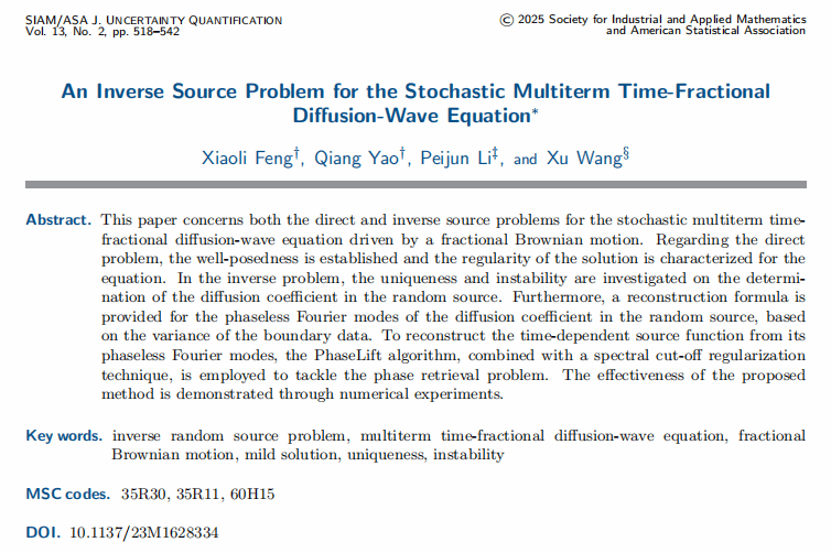 近期,betway88西汉姆联冯晓莉副教授,研究生姚强和中国科公司数学与系统科学研究院李培军研究员,王旭副研究员合作,在随机微分方程反随机源的理论分析和数值计算方面取得新进展,相关结果发表在美国工业与应用数学学会旗下重要期刊SIAM/ASA Journal on Uncertainty Quantification上 [Xiaoli Feng, Qiang Yao, Peijun Li, Xu Wang, An inverse source problem for the stochastic multi-term time-fractional diffusion-wave equation, SIAM/ASA Journal on Uncertainty Quantification, 13(2), 518-542, 2025]。