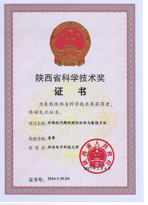公司刘三阳教授主持完成的项目《非线性问题的理论分析与数值方法》获陕西省科学技术奖一等奖,其获奖团队主要成员还有吴事良教授、常永奎教授、高卫峰副教授、卢楠副教授、冯晓莉副教授、贺慧敏副教授。该成果包括50篇SCI检索论文,其中1篇入选ESI全球热点论文,5篇入选ESI高被引论文,截止2016年4月,SCI他引总计886次,单篇文章最高SCI他引133次。
