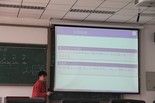 赵显锋博士介绍了Hardy空间,Bergman空间以及这些空间上的Toeplitz算子,并深入浅出地讲述了Bergman-Toeplitz算子谱的连通性的研究背景,之后分享了他关于此问题的最新研究进展。随后,王绪迪博士介绍了不变子空间,约化子空间问题,并分享了他利用分次结构方法研究的一类解析Toeplitz算子的不可约性的最新成果。最后,两位博士对老师及同学们提出的问题给予了详细的解答。