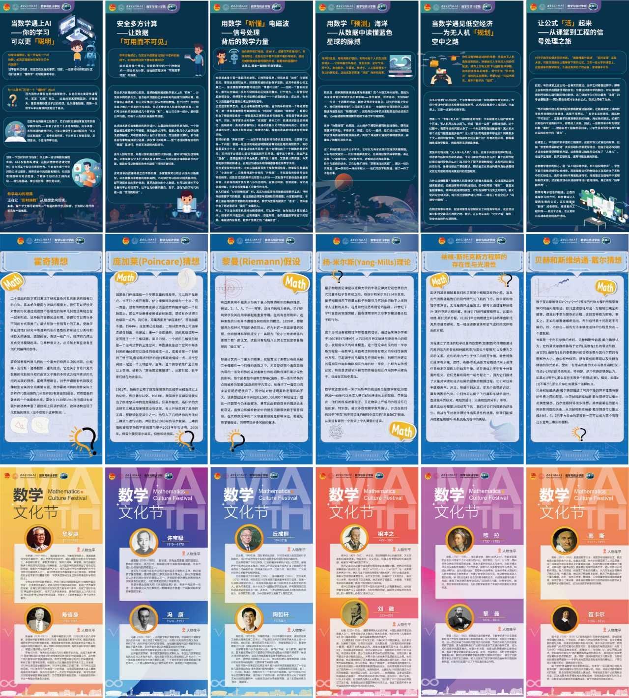 数学文化展览区全方位展示数学文化的深厚底蕴。展区内,古今中外著名数学家的事迹展板呈现数学发展历史脉络;数学与人工智能、大数据、电子信息等学科的交叉应用案例,直观展现数学的实用价值;经典数学猜想的图文解析激发师生对数学未知领域的探索热情。