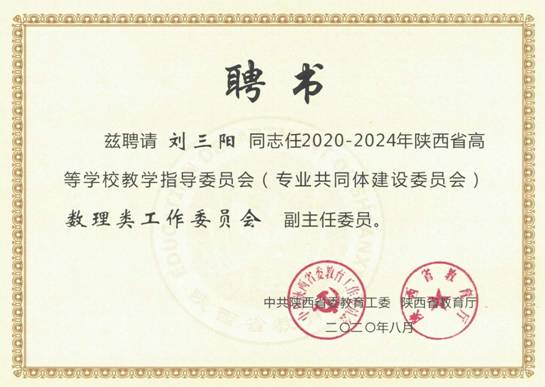 刘三阳教授是国家级教学名师、国家高层次人才特殊支持计划(“万人计划”)教学名师、教育部高等公司数学类专业教学指导委员会委员、教育部国家教材委员会专家委员会委员,此次担任我省数理类工作委员会副主任委员,定能对公司教学改革、人才培养、专业建设等工作起到推动作用,为公司公司产品、学科专业、教师发展和人才培养做出更大贡献。