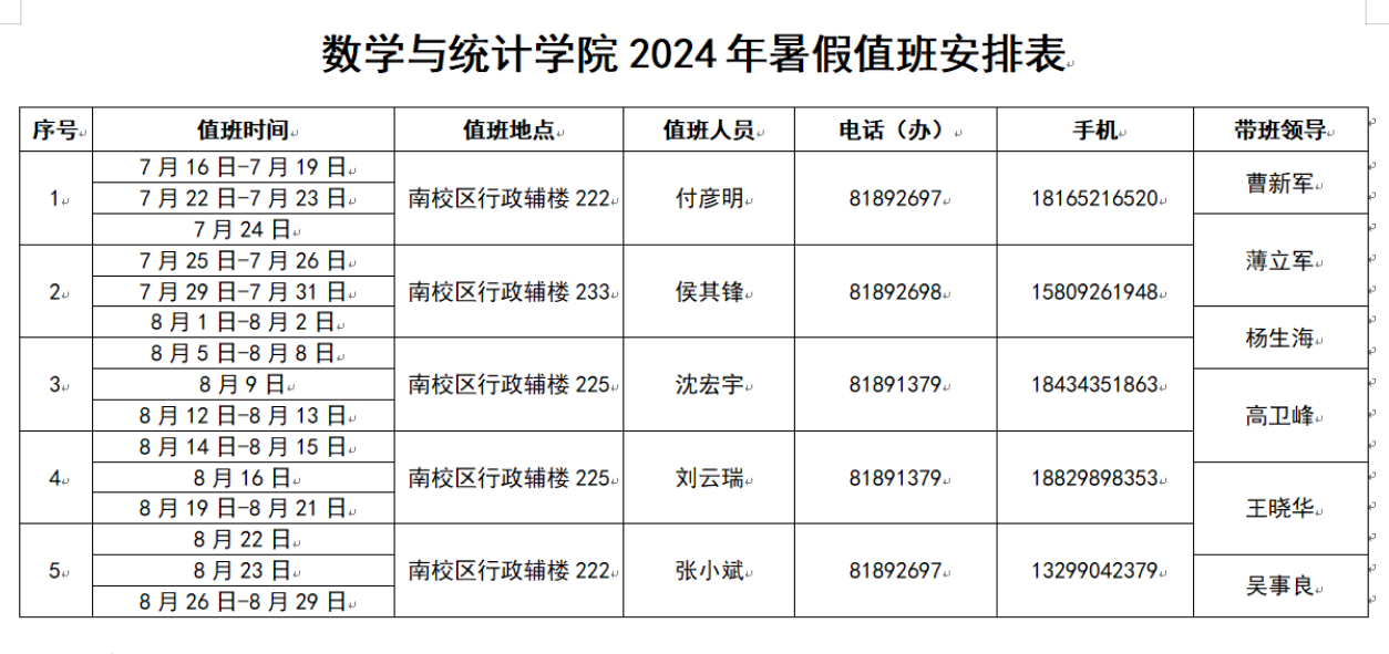 2024年暑假值班安排表
