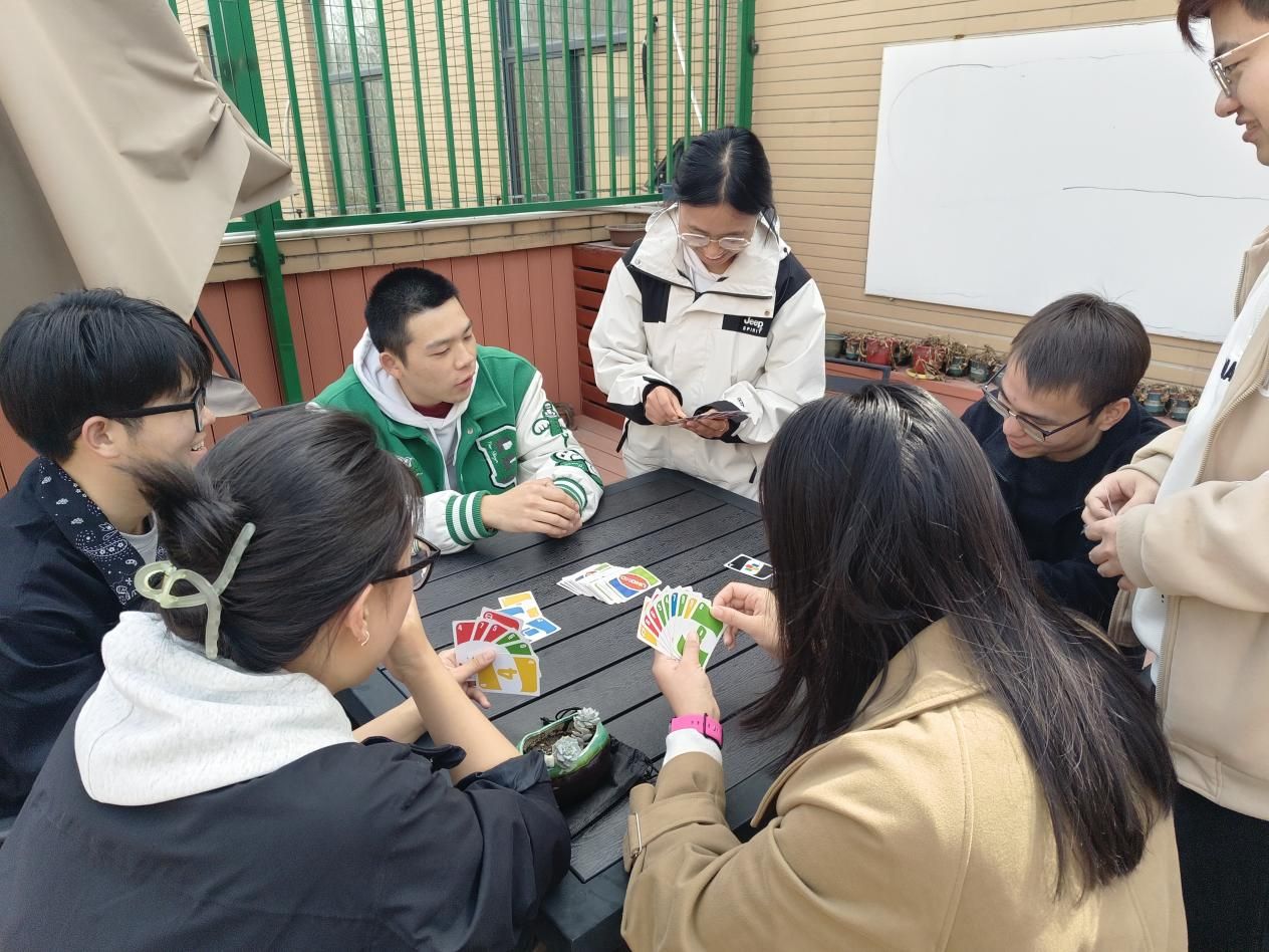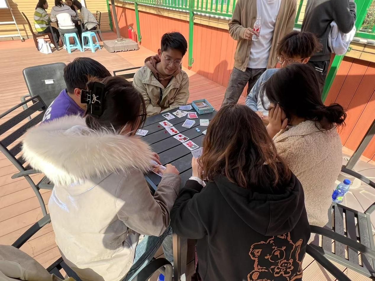 比赛过程中,大家展现出了高度的热情。在象棋区域,一场场智慧的激烈较量正在上演。老师和同学们两两对决,棋盘之上,将士们纵横驰骋。棋手们有的手托下巴陷入沉思,有的则果断落子。每一步棋都蕴含着他们对局势的精准判断,每一局棋赛都是智慧与策略的较量,老师和同学都沉着冷静、积极思考,全力以赴。更是吸引了许多同学前来围观,大家共同思考棋局,讨论策略,师生之间情谊也在这一过程中得到加深。桌游区域则充满了欢乐与惊喜。玩家们围坐成一圈,全神贯注。现场气氛时而紧张刺激,时而又引起同学们阵阵惊呼与欢笑,在每一轮的发言环节,大家各抒己见,凭借逻辑推理和言语交锋,全力达成各自的目标。