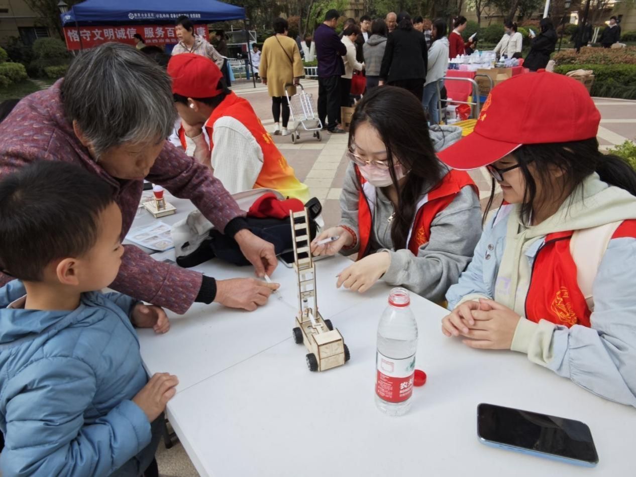 活动现场,最受瞩目的区域当数科技小发明制作区。空气助推小火箭、自动避障小车、手摇发电机、液压云梯车等充满创意与科学原理的项目整齐陈列,吸引了众多青少年和儿童的目光。志愿者们化身耐心细致的科学导师,手把手指导孩子们进行制作,并用通俗易懂的语言向小朋友们详细解释了每个实验背后的科学原理,帮助他们更好地理解科学现象。