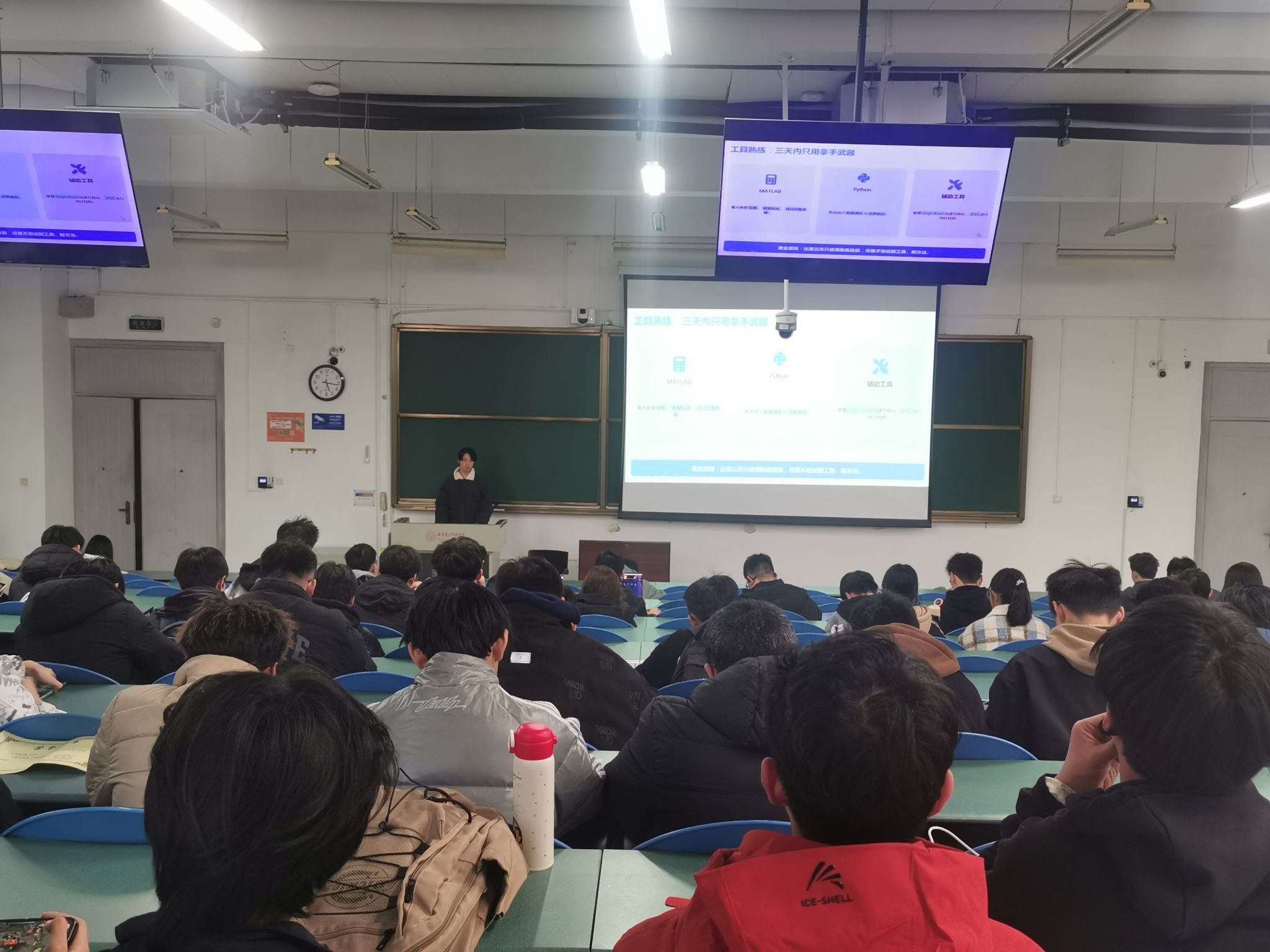 分享会聚焦数学建模,由国赛获奖学长姚鸣泉主讲。姚鸣泉从赛前、赛中、赛后全流程为脉络,为同学带来系统备赛指南。在赛前准备阶段,姚鸣泉学长强调“把慌乱留在训练场”,数模比赛并非即兴创作,而是长期积累的集中输出。同时他结合国赛题目的解读,讲解了备赛的方法并推荐《数学建模算法与应用》及B站精选课程等学习资源。工具准备方面,他详细介绍了Python、MATLAB等核心软件的必备工具箱,以及Mathtype公式编辑、Origin数据可视化等辅助工具的使用技巧,强调赛前需完成环境搭建与测试,避免比赛中出现版本冲突等问题。谈及赛中策略,学长分享了心态上要坚守“不焦躁、不贪多、不纠结”原则,拒绝“完美模型”执念,优先保证方案合理可解释。分工协作方面,要明确队伍每个人的核心职责,强调角色接口清晰、线下集中做题是避免“彼此等待”的关键。遇到卡点时,应立即更换角度或简化假设,资料查阅需“查思路不抄代码、学方法不搬模型”,禁止借助人工智能生成完整模型或论文。在赛后复盘环节,学长分享到,比赛的价值不仅在于结果,更在于长期沉淀。他建议从选题匹配度、模型优化空间、流程效率、论文表达四个维度进行系统复盘,将所有代码、文档、数据整理归档,建立团队“武器库”,固化模型模板、工具样式、文献与代码片段库,通过定期技术分享保持对新算法、新赛事趋势的敏锐度,实现持续进化。