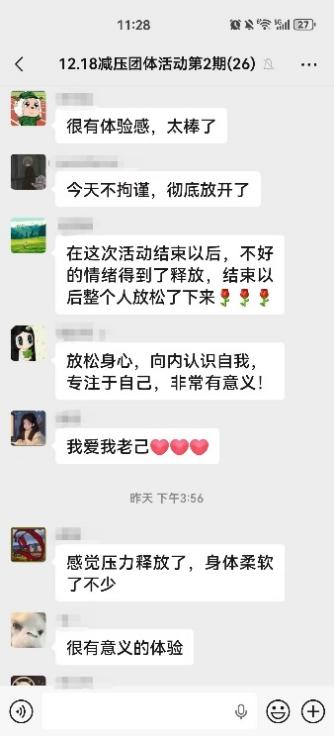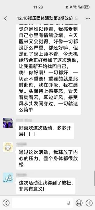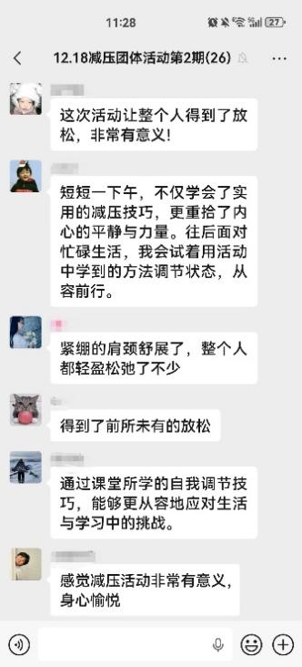 活动尾声,同学们在宁静的氛围中进行了正念练习与开放式分享。大家坦诚交流科研学习中的困惑与日常压力,也在倾听中感受到彼此的理解与支持。最后老师总结:“成长不是孤身上路,而是在自我觉察中更好接纳自己,更好地与他人相伴。”同学们普遍反映,此次活动不仅学到了一些实用的减压方法,更是体验到了集体的支持与温暖。这种从应该如此到本来如此的观念转变,正是心理健康教育追求的终极目标——学会自我接纳,与不完美和解。