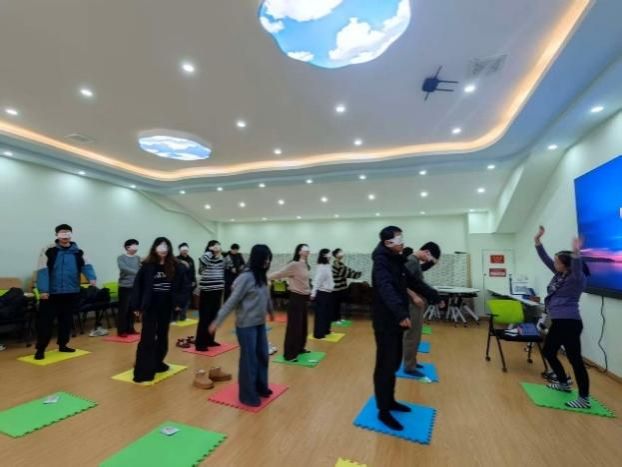 伴随舒缓的音乐,老师带领大家进行呼吸调整与渐进式身体放松练习。借助引导语,同学们逐渐将意识从外部转向自身,细致感知呼吸的节奏与身体的细微变化。参与同学分享道:“当闭上双眼、专注呼吸时,外界的纷扰仿佛悄然远去,我终于能够清晰听见自己内心的声音。”这种身体与心灵的双重打开,让参与员工真正体会到了与自我对话的奇妙感受。