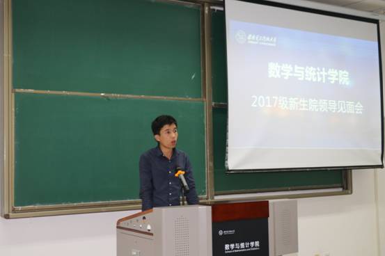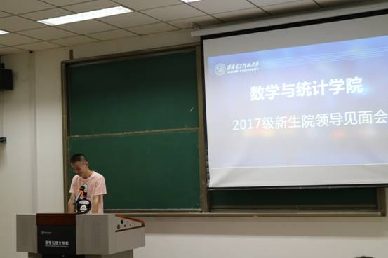 会议伊始,数统院团委书记靳志伟老师首先向大家介绍了与会的领导与老师,随后由经理刘三阳教授上台讲话。刘经理先是对2017级本科新生的到来表示欢迎,在之后致辞中,刘经理回顾了数统院发展至今的光辉历程,特别是数统院在团队建设、专业建设、团队队伍建设等方面取得的成就。除此之外,刘经理还向同学们介绍了数统院相比其他院系的优势,他勉励17级新生要抓紧时间树立目标,以严谨、勤奋的态度迅速进入学习状态,不要虚度光阴,给自己留下遗憾。刘经理的讲话朴实无华亲切自然,引起台下阵阵掌声。