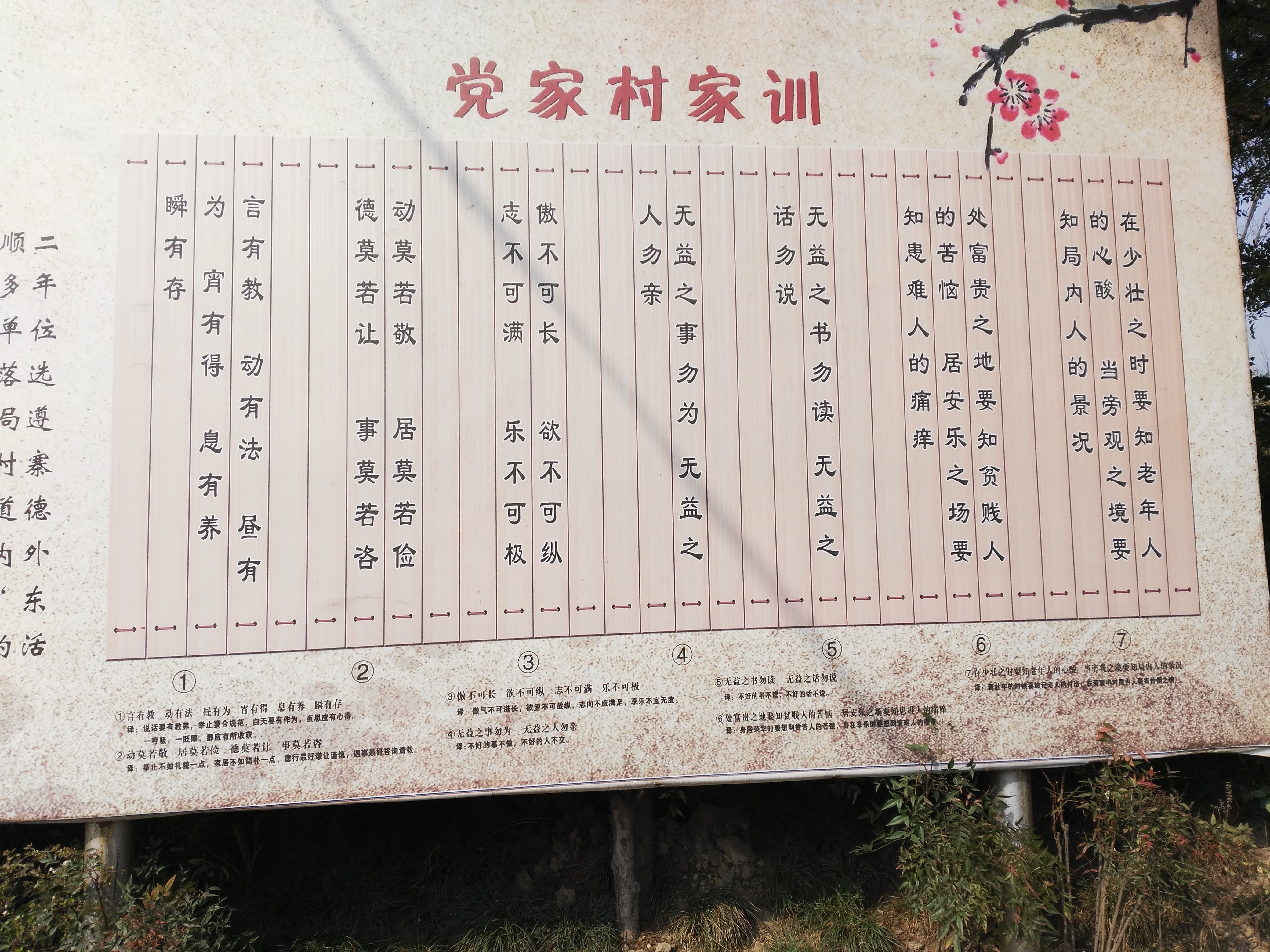 党家村家家户户正对大门的厅房两侧墙上都刻有党家村先人留给子孙的处世格言,那闪耀着传统儒家思想的精湛文字,不仅书法考究,也如实地反映了宅主的身份与修养,以及处世的思想。这些门庭家训不仅有重视读书的内容,更是品德修养方面的格言警句。