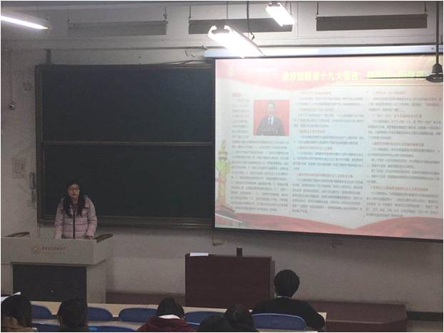 常老师从老员工要学习贯彻党的十九大精神出发,跟同学们一起学习党的十九大报告中一系列新思想、新论断、新提法、新举措,常老师就报告中切实增强学习贯彻习近平新时代中国特色社会主义思想的政治自觉、思想自觉和行动自觉,把思想和行动统一到习近平新时代中国特色社会主义思想上来,她倡导同学们宣传好党的十九大精神,听党话跟党走,以实际行动贯彻落实党的十九大精神,凝聚起同心共筑中国梦的磅礴力量。