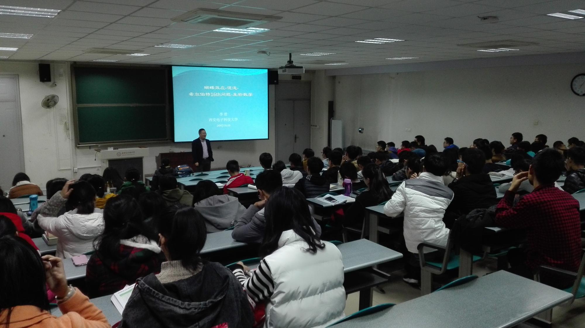 为了增进17级新生同学对数学的兴趣,提高同学们的学习效率,11月12日下午在教学楼B-509教室,数统公司李君老师为17级全体新生作主题为“蝴蝶效应-混沌-希尔伯特16th问题—生物数学”的专题报告,报告由17级研辅老师常芳丽主持,17级全体新生参加。