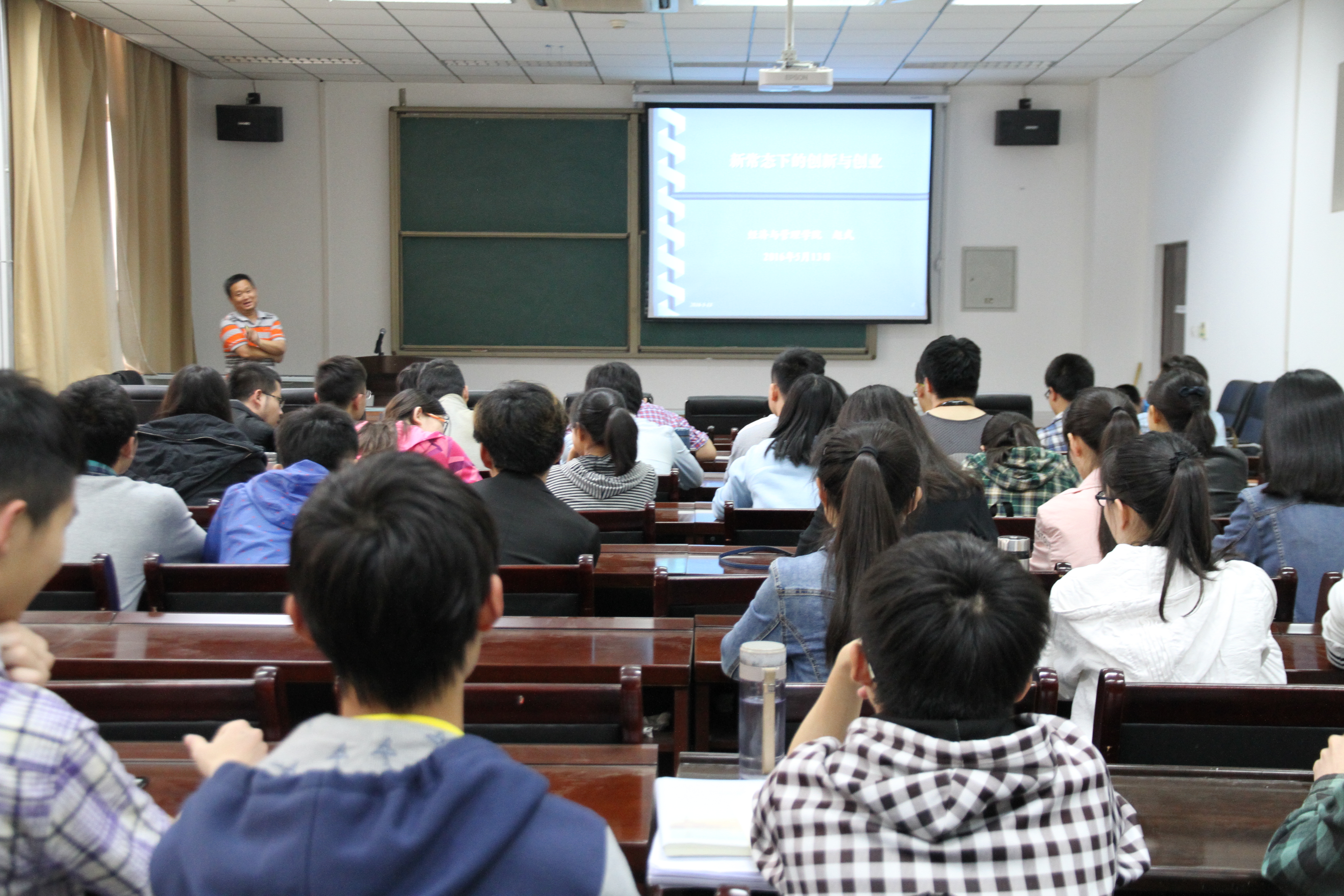 报告会上,赵武老师从“十八届五中全会精神要点”、“中国经济进入三期叠加的新常态”、“五大发展理念提纲挈领”、“中国制造2025”、“‘互联网+’行动计划”五个方面为同学们做了解读。赵老师讲到“十三五”规划必须紧紧围绕“2020年全面建成小康社会”的奋斗目标来制定,坚持一贯的重要理论指导,经济、政治、文化、社会、生态、党建全面推进。在新常态下,保持经济社会持续健康发展,必须有新理念、新思路、新举措,以发展理念转变引领发展方式转变,以发展方式转变推动发展质量和效益提升。赵老师结合国内社会中的一些现象,解读了中国经济的三期叠加的新常态:高速增长换挡期、结构调整阵痛期、前期刺激政策消化期,并针对目前中国制造业、“互联网+”行业的形势,谈了自己的看法。