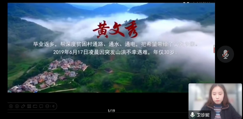 第一位宣讲人卫珍妮围绕“大山的女儿”黄文秀的人物事迹进行宣讲,她从黄文秀是如何在党和国家的帮助下一步步完成学业开始讲起,详细讲述了黄文秀以生命坚守扶贫初心的感人故事。2016年,黄文秀从北京师范大学研究生毕业后,放弃在大城市工作的机会,毅然回到家乡百色,主动投身扶贫一线,为振兴乡村贡献力量。她带领群众搞种植,发展农产品电商,实现了贫困家庭户户有致富门路,村集体经济项目收入翻倍的目标。在黄文秀不幸遇难后,习近平总书记向她的家人表示亲切慰问并说道:“黄文秀同志研究生毕业后,放弃大城市的工作机会,毅然回到家乡,在脱贫攻坚第一线倾情投入、奉献自我,用美好青春诠释了共产党人的初心使命,谱写了新时代的青春之歌,广大党员干部和青年同志要以黄文秀同志为榜样,不忘初心、牢记使命,勇于担当、甘于奉献,在新时代的长征路上做出新的更大贡献。”最后,卫珍妮鼓励大家向黄文秀书记学习不忘初心、牢记使命的精神,以蓬勃的朝气和昂扬的锐气奋斗新时代、展现新作为。