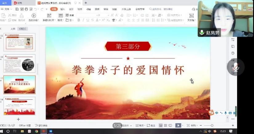 第二位宣讲人赵凤男围绕“革命烈士家书”进行宣讲,她深情讲述了夏明翰、方志敏、刘伯坚、赵一曼等革命烈士感人肺腑的家书,以及这一封封直指心灵的家书中彰显的爱国情怀、斗争精神和政治本色。革命烈士家书是革命者之间或他们与亲友交换思想、交流感情的信件,在风雨如晦的战争年代,家书承载着战火的回忆,蕴含着亲情的温暖,诉说着无尽的思念,寄托着殷切的祝福,是革命烈士留给后人无比宝贵的精神财富。习近平总书记指出:“我们的红色江山是千千万万革命烈士用鲜血和生命换来的。江山就是人民,人民就是江山。我们绝不允许江山变色,人民也绝不答应。吃水不忘挖井人。新中国成立70多年来,经过一代又一代人艰苦奋斗,我们的国家发生了翻天覆地的变化,人民过上了全面小康生活,中华民族屹立于世界民族之林。我们要继续向前走,努力实现中华民族伟大复兴,以告慰革命先辈和先烈。”最后,赵凤男说道:“天地英雄气,千秋尚凛然。无论是过去现在还是将来,我们都要永远铭记英雄烈士为国家和民族做出的牺牲和贡献。我们要传承和弘扬他们的革命精神,矢志不渝地为国家和人民而奋斗,在新征程中续写时代华章。”